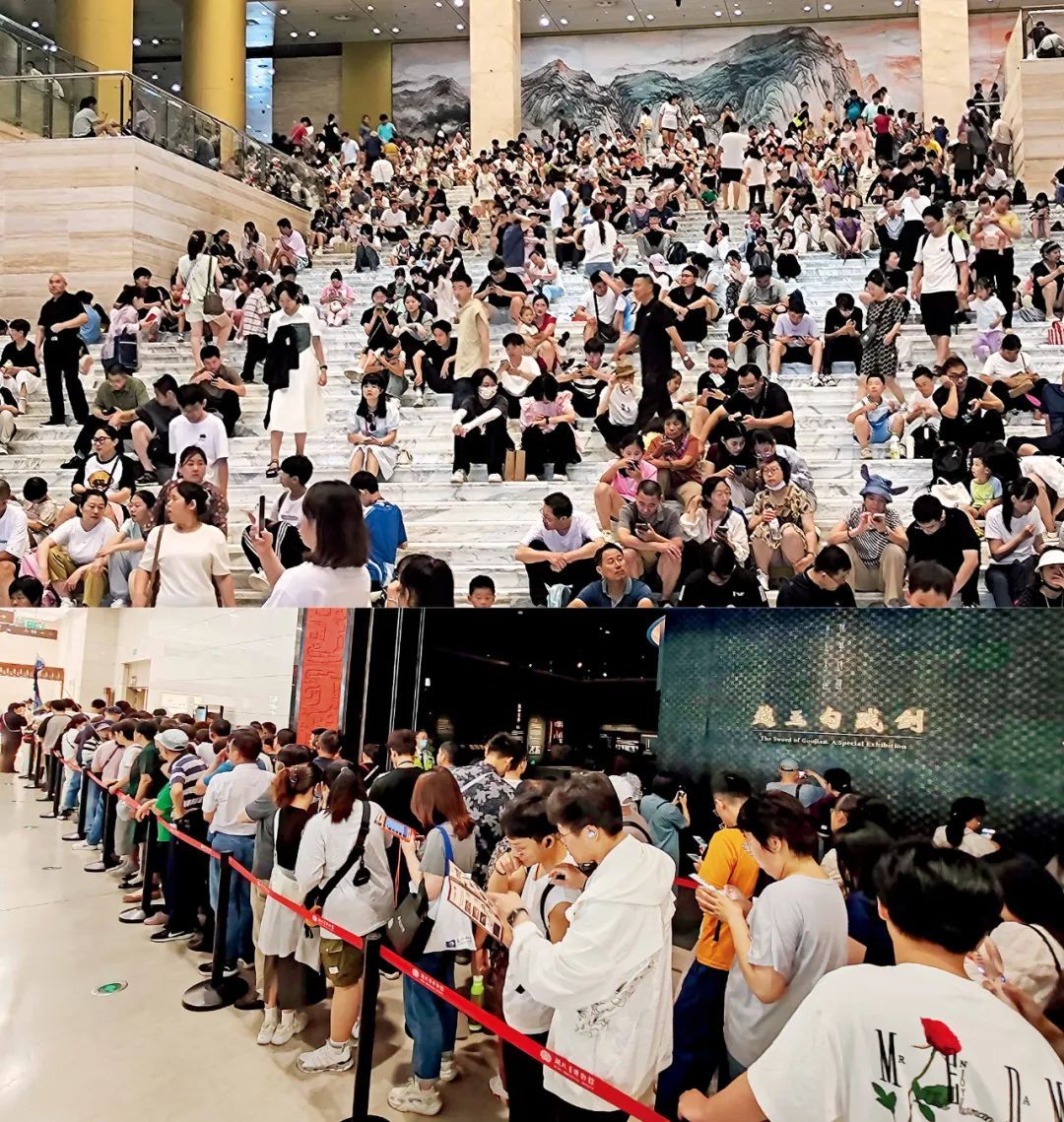 上图:7月14日,山东省博物馆内的大量游客。下图:5月17日,游客在湖北省博物馆排队。