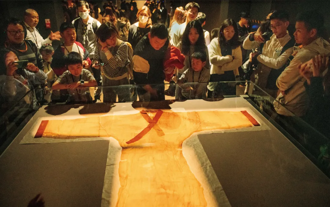 4月5日,湖南省博物馆,游客观看马王堆汉墓出土的汉服。